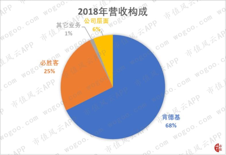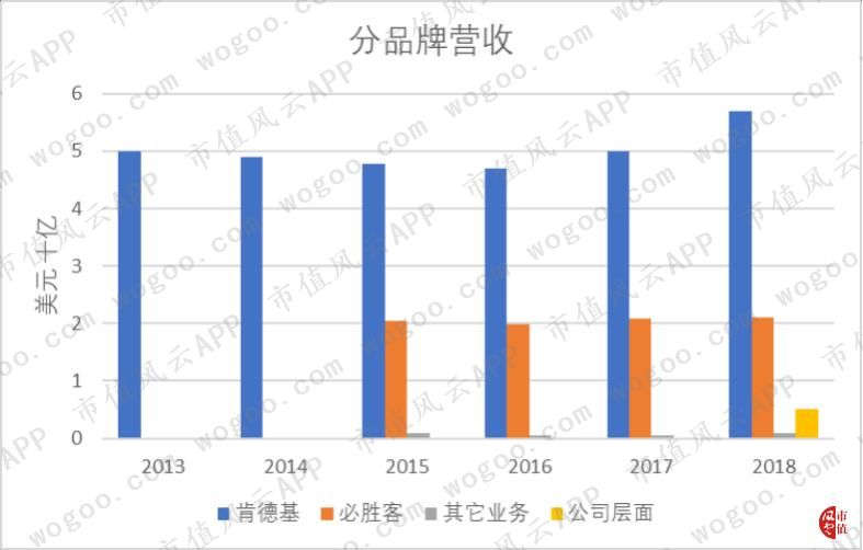 分品牌来看,2018年肯德基营业收入为56.9亿美元,必胜客为21.1亿美元,其它品牌合计1亿美元,占总营收的比例分别为68%、25%和1%。