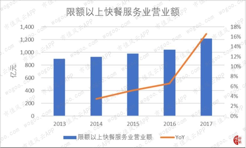 而2013-17年,中国限额以上快餐服务业(注:限额指200万元以上营业额)营业额的CAGR为7.8%,同时期肯德基几乎没有增长。