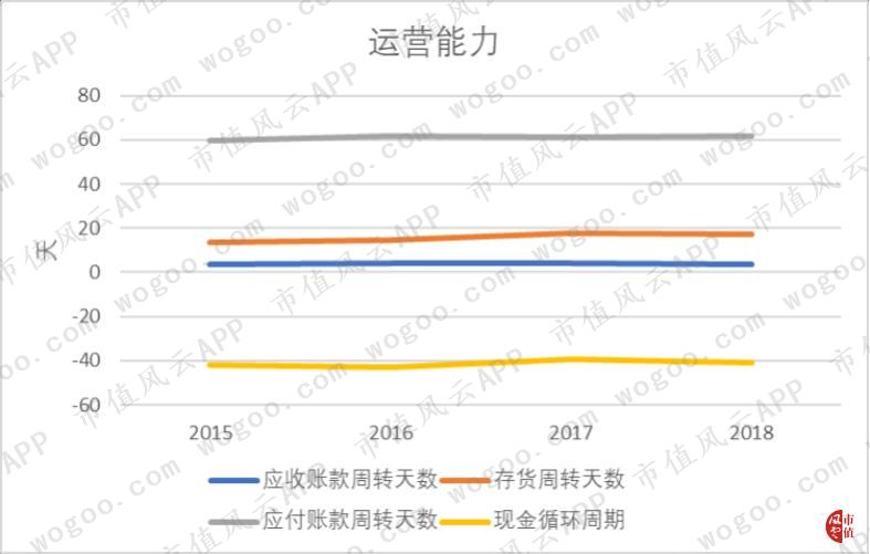 2018年,公司的应收账款周转天数、存货周转天数和应付账款周转天数分别为3天、17天和62天,现金循环周期为-41天。