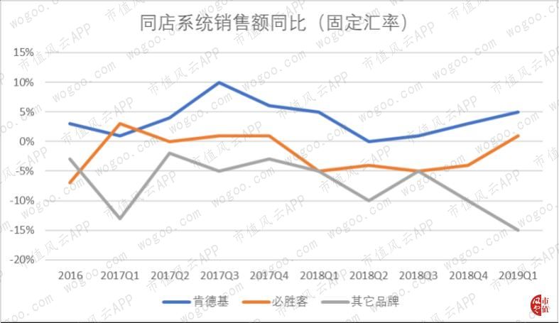 2017年一季度以来,肯德基的系统同店销售额(注:包含公司拥有的餐厅、未合并联营餐厅和特许经营餐厅)同比增长持续为正数,其中2019年一季度为 5%。