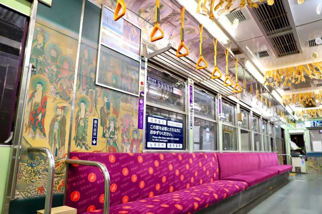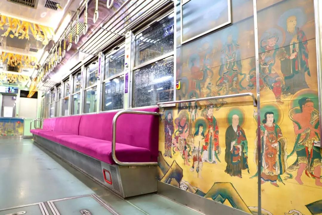 车身、车头⋯⋯紫色外观外还都画满观音菩萨画像,这班列车从车站开出来,感觉会一路都不断发光呀!