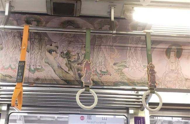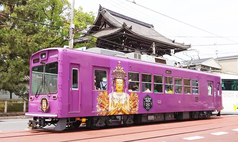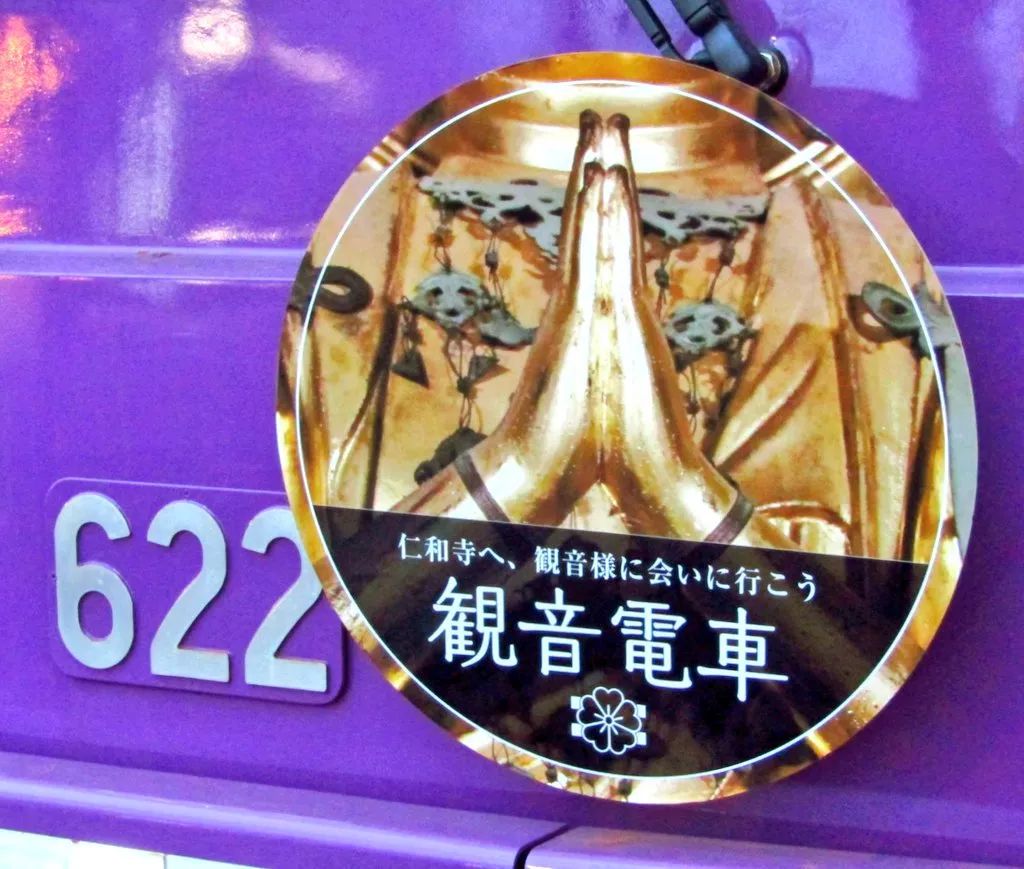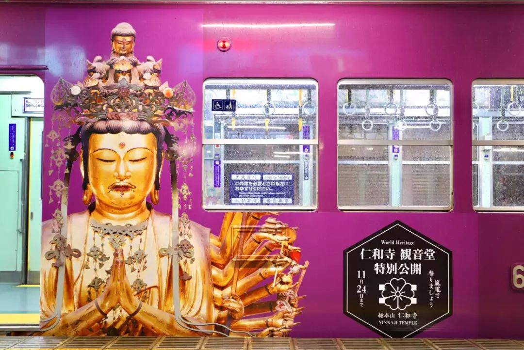 京都仁和寺携手京都市观光协会及JR西日本,以仁和寺观音堂微设计被景,推出「岚电·观音电车」岚特色列车,将岚山621型622号的列车内装,融入观音二十八部众以及古老壁画意象,其中最注目的莫属千佛之手的广告纸板。
