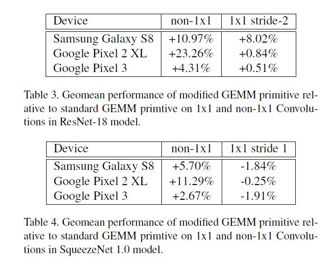 可以看到一旦步长增加,那么Indirect convolution带来的性能提升就会明显下降,这是因为步长越大,在原始的GEMM算法中重复计算的量就会减小,因此原始GEMM的性能本身就会提升,而indirect convolution并不受益于步长增加。