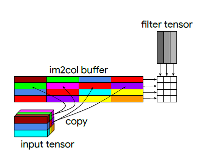 其中 im2col buffer 代表矩阵A,filter tensor 代表矩阵B,A和B的乘积就是输出copy表示将输入的张量展开为一个二维矩阵,也就是im2col buffer。可以看到buffer的每一行则是由固定个数(步长)的pixel展开成一维的向量组成的,这些pixel都在原始tensor中的一个patch内,在经过和filter tensor相乘后,由于矩阵行列相乘得到一个元素,因此这几个pixel的信息都被整合成了一个值,也就是对他们进行了卷积操作。最后在输出矩阵C中,行数rows代表输出的像素点个数,columns代表输出的channel数。可以看到buffer的columns是和输入channel数有关的。