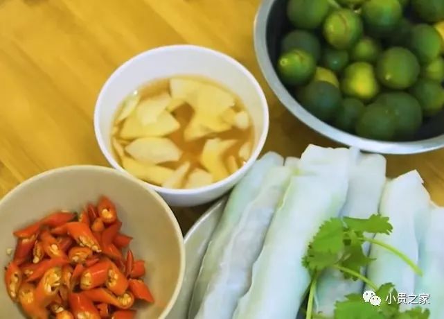 不过,越南那边的肠粉跟广东肠粉不一样。吃过广东肠粉的朋友就知道,广东肠粉都是直接把酱汁淋在肠粉上面的,但是越南那边的肠粉却是用到图中这些调味料。其中就有辣椒,姜汁还有青桔,那么,这些调味料越南人是怎么用来吃这肠粉的呢,我们一起看看吧。