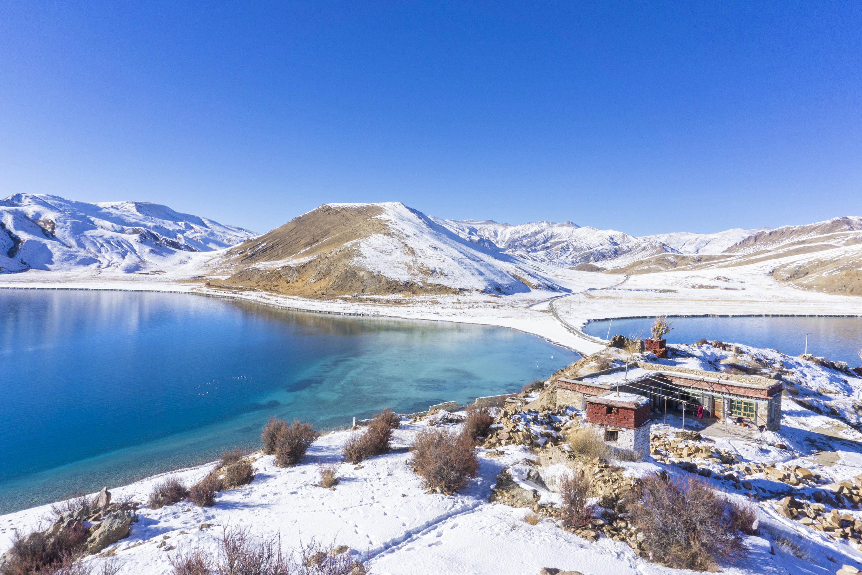 经过一个上坡之后,蔚蓝色的羊湖再次出现在眼前,而道路的尽头是一个湖中的小岛,小岛上便是日托寺,周围是广阔的藏区草原,没有任何多余的现代建筑,雪后的无限画面更显纯净,这条通往小岛的道路,仿佛就是走向世界尽头的道路,热泪盈眶心情分外的激动,这就是我第一次看见日托寺的感受。