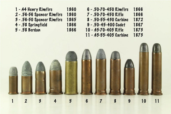 而有些老弹特别是黑火药弹命名则是口径+装药量,比如.30-40Krag代表.30英寸口径,40格令装药,(关于格令这个单位,红脖子最先用来称粮食的,约等于一粒麦子的重量,后来发现用来称“狗粮”也合适。1格令合64.8 毫克)而.45-70全称.45-70-300,指口径.45英寸,装药70格令(4.54克),铅弹重300格令(19.4克)...看着就蛋疼