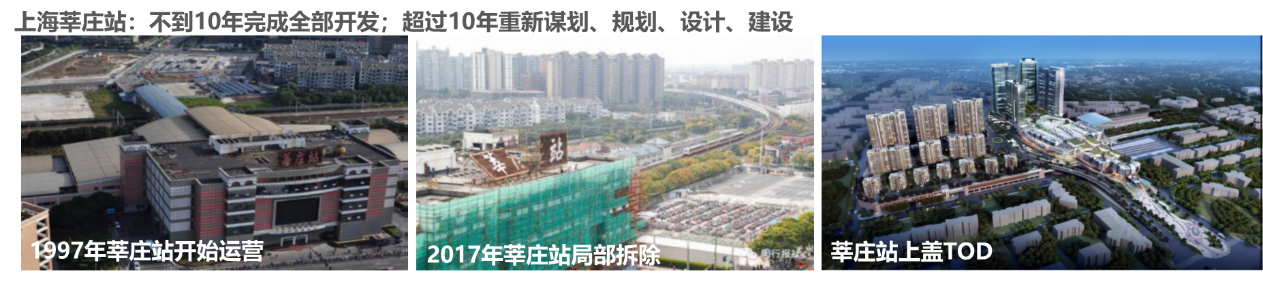 城市轨交站(主要指的是短距离城市内轨道交通和地铁):纵向发展为主的站城一体。项目待开发存量极大,市场空间广阔。