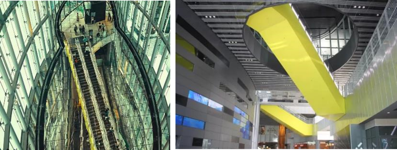 图片说明:连接涩谷站各条线路及交叉口的地下地下多层一体化立体交通,电梯及自动扶梯组成的醒目黄色标志性的立体交通空间,提高区域的回游性和地下空间的安全疏散能力。