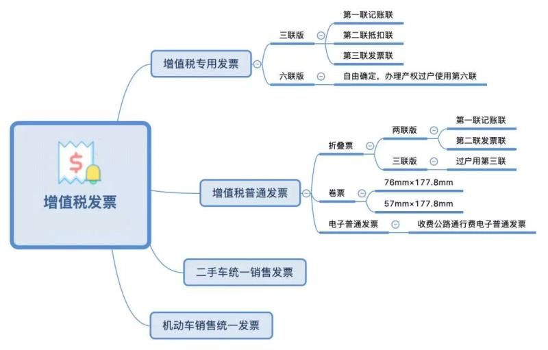 增值税发票可以分为增值税专用发票、增值税普通发票、二手车统一销售发票、机动车统一销售发票四类。如下图所示: