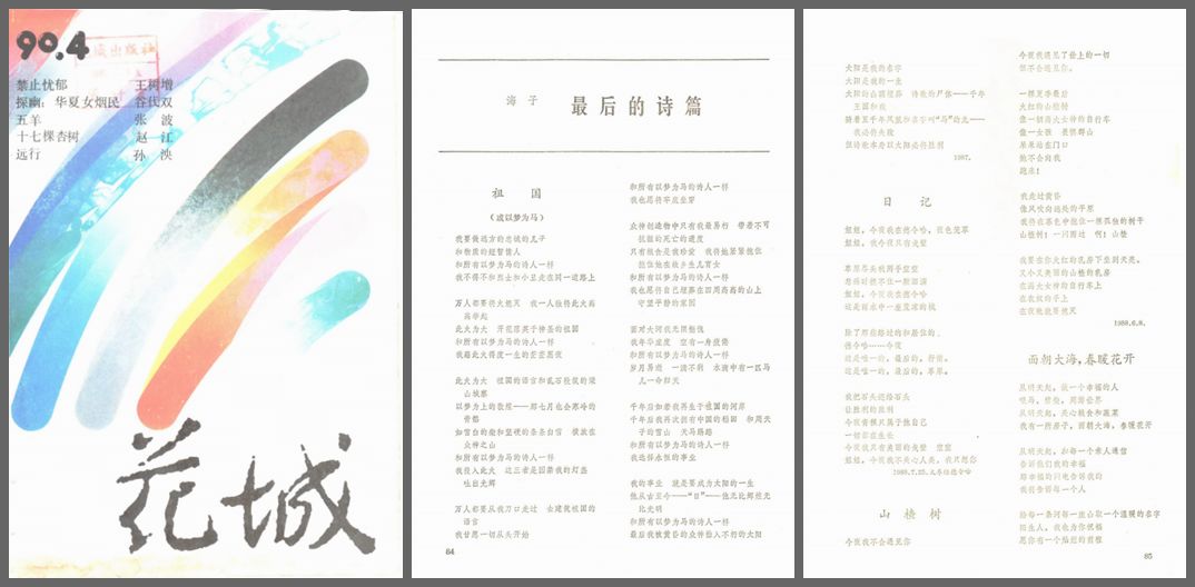 90年代《花城》的“诗歌”栏目也相当可圈可点。80年代《花城》的“诗歌”栏目并未与最前沿的诗歌变革走在一起,除1981年第2期发过当时已经成名的北岛、舒婷作品外,栏目并未能反映当代诗歌的涌动和潮汐。但在八九十年代之交,《花城》“诗歌”栏目焕然一新,1988年第5期刊出西川、骆一禾(用名一禾)作品;1989年第4期刊出李亚伟作品;1989年第6期刊出伊蕾作品;1990年第1期刊出李亚伟、陈东东、骆一禾作品;1990年第4期刊出骆一禾、海子、西川、杨多乐作品,其中海子诗歌就包含了那首后来家喻户晓的《面朝大海,春暖花开》。此阶段在《花城》出现的诗人主要是80年代中后期崛起的第三代诗人群,他们的作品整体上代表了当代先锋诗探索的艺术水位。90年代在《花城》出现的诗人还包括:王寅、韩东、戈麦、钟鸣、肖开愚、臧棣、杨黎、柏桦、何小竹、万夏、蓝马、于坚、杨键、吕德安、欧阳江河、王家新、大仙、陈先发、邹静之、叶延滨、严力、周伦佑、朱朱、张枣、翟永明、庞培、潘维、朱文、鲁羊、清平、王小妮、陆忆敏、杨小滨、马永波、海男、虹影、叶维廉等(以上排名完全随机),除少数几位跨界诗人如邹静之、虹影、叶维廉等外,上述诗人在90年代相当具有代表性,在相当程度上呈现了90年代当代诗歌艺术探索的内部景观。而像王家新的《瓦雷金诺叙事曲》(1992年第6期)、西川的《致敬》(1994年第1期)、于坚的《飞行》(1998年第4期)都属90年代诗歌名篇;“四川五君”诗歌小辑(1993年第6期,包括钟鸣、张枣、欧阳江河、柏桦、翟永明)大概也是综合文学期刊较早接受并使用“四川五君”这一概念的。90年代《花城》“诗歌”栏目的突出表现,既跟当时的诗歌编辑袁安等人同时也是诗人有关,更跟90年代《花城》整体的先锋定位相关。