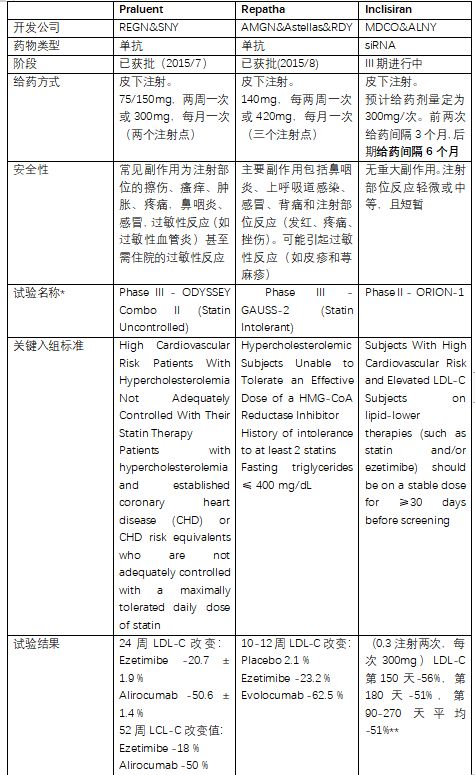 目前作用于PCSK9的在研药物还有一款单克隆抗体,两款疫苗,一款antisense药物,研发久未更新或多次延迟或仅处于I期,暂不考虑。