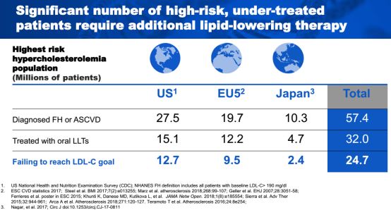 而在5740万已诊断为家族性高胆固醇血症(FH)或ASCVD的患者中,美国、EU5和日本共有2470万的病人未能达到LDL-C<70mg/dL的治疗目标。在美国和EU5,未能达标的患者比例高达46.2%和48.2%。