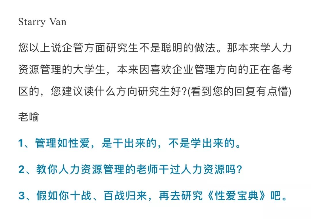 事实上,那些管理、人力资源、MBA,如果毫无工作经历,去读个研究生,和婚前上两年的书本性学课有啥区别?