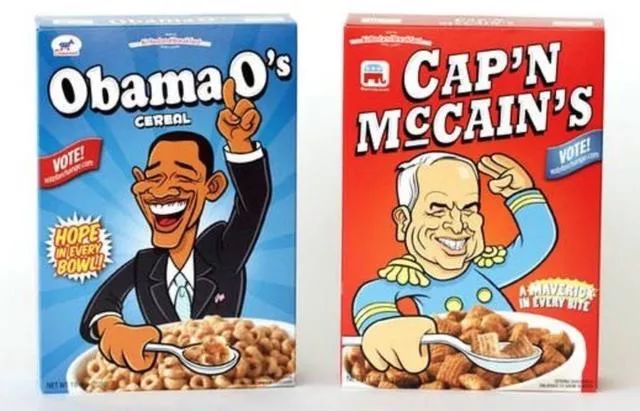 去超市买来一美元一袋的麦片,自己动手,装入总统候选人主题的盒子里。