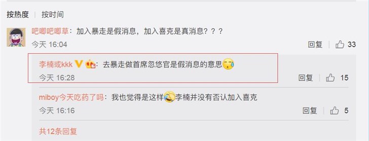 值得一提的是,今天早些时候还有媒体报道称,李楠将和罗永浩一样去电子烟领域创业。李楠今天下午在微博回应网友称其“加入暴走做CHO”的消息为“假消息”,同时在评论中称“去暴走做首席忽悠官是假消息的意思”,因此李楠并没有否认离职创业的传闻,而只是否认去暴走做CHO。