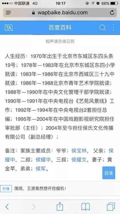 《牡丹晚报》是由菏泽日报社主办的生活类晚报,按说真实性应该不会太低,但就目前所能找到的资料来看,这篇文章只是该报记者根据对侯召民本人的采访而写成,并没有其他旁证。另外,小马注意到,根据网友的截图,在百度百科上曾经存在这位侯召民的资料,在资料的末尾,确实足够“低调”地存在一段关于家族主要成员的备注。