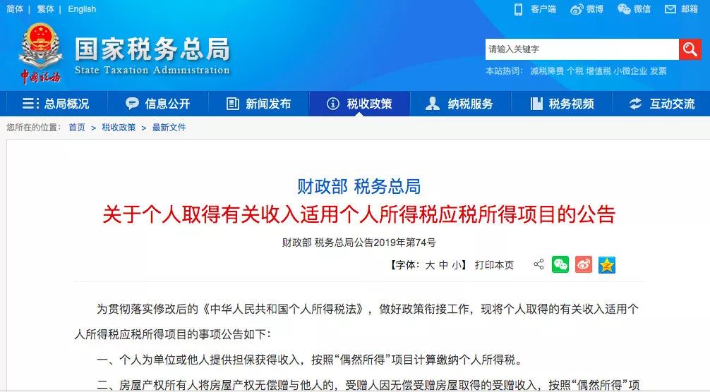 近日,财政部、税务总局发布《关于个人取得有关收入适用个人所得税应税所得项目的公告》,将部分原按“其他所得”征税的项目调整为按照“偶然所得”项目征税,偶然所得适用税率为20%,与原“其他所得”税率相同,纳税人的税负保持不变。
