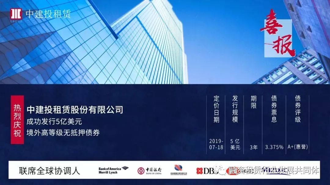 7月18日,中建投租赁在境外成功发行5亿美元高级无抵押债券。