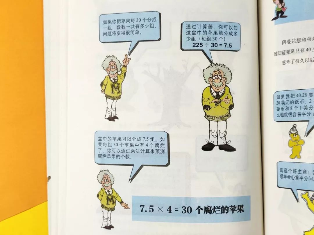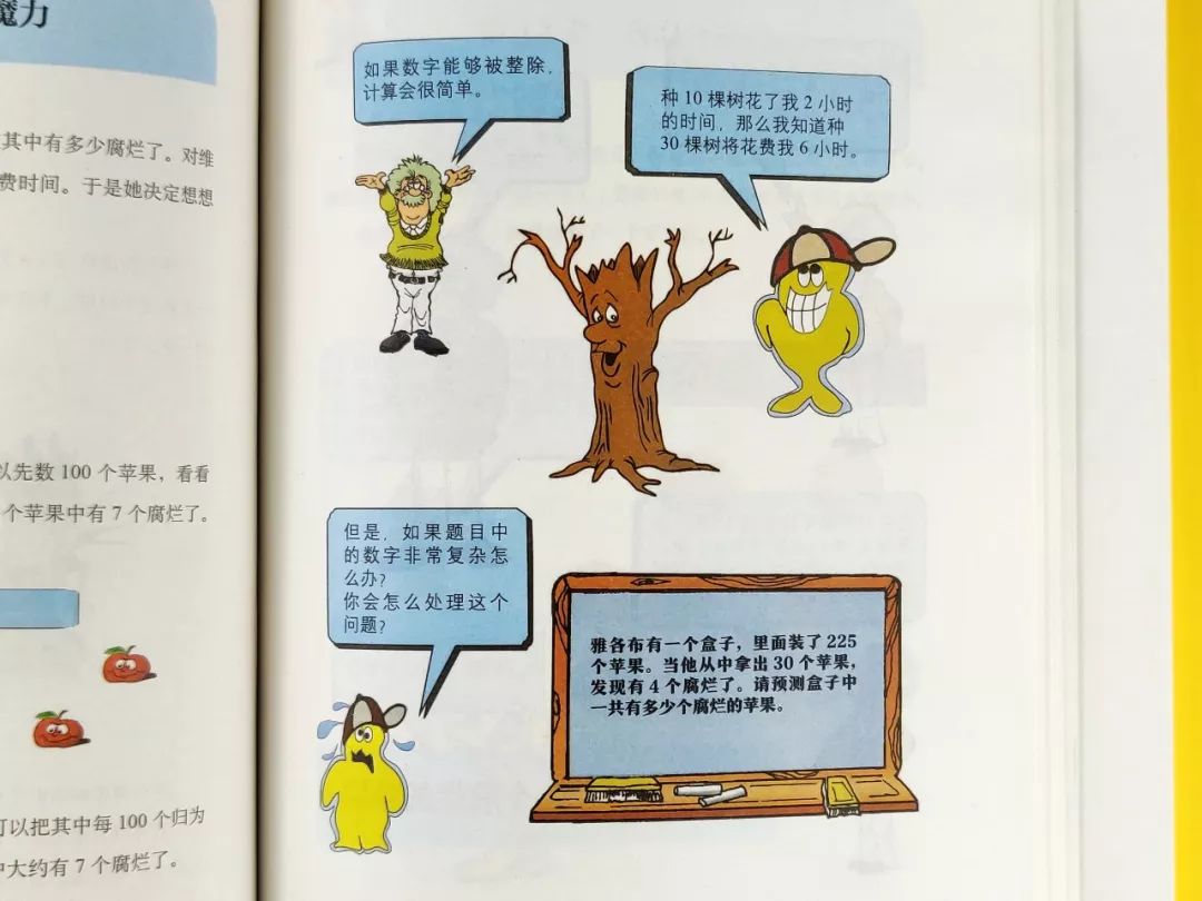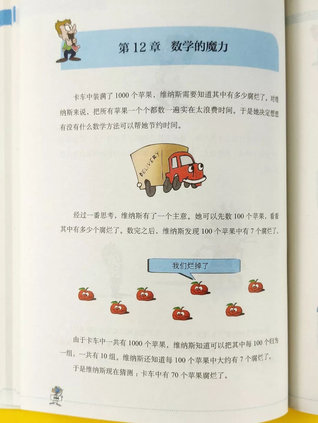 例如《跟爱因斯坦一起玩数学》第十三章数学的魔力中,卡车中装1000个苹果,维纳斯需要知道其中多少个腐烂了,一个个数太浪费时间了,怎样可以节约时间呢?