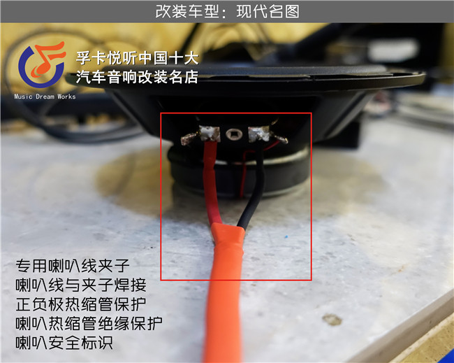 中低音喇叭接线细节效果图,专用喇叭线夹子焊接,正负极热缩管保护。