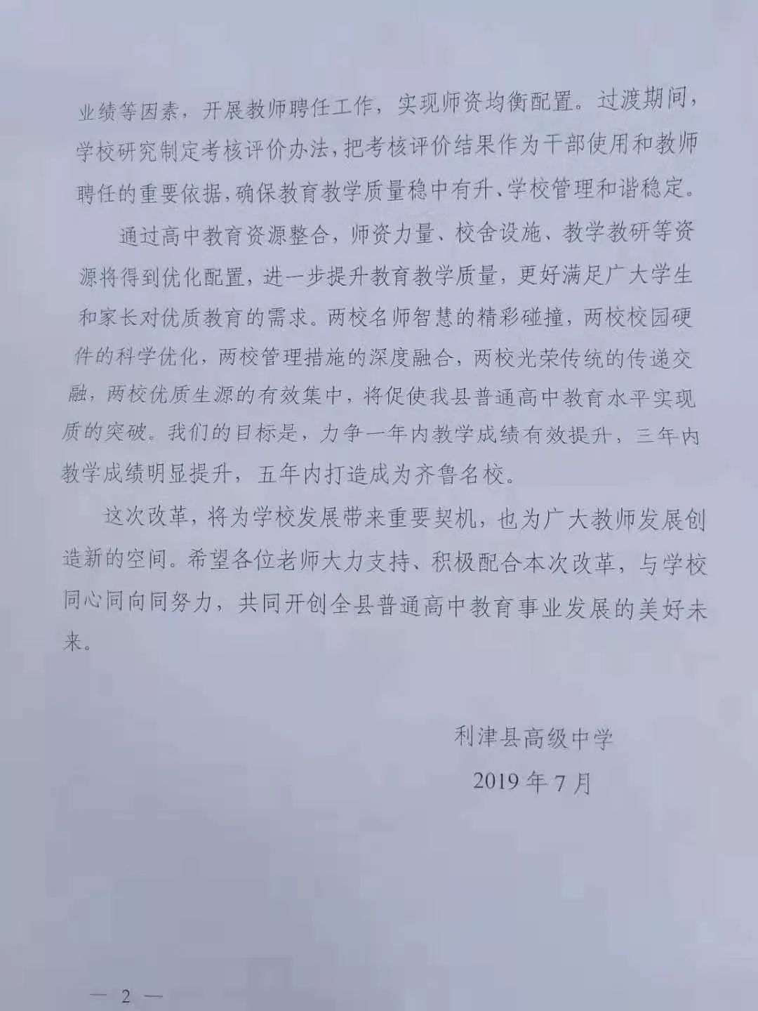 这次全县普通高中教育资源整合,将我县两所普通高中合并为“利津县高级中学”,按照“总体规划,分年实施,平稳过渡,优质发展”的思路,从2019年秋季开学起,对新招高一年级学生和任课教师进行整合,到2021年全部整合完成,现在的利津一中北校区将成为利津县高级中学北校区,设置为高三级部;现在的利津二中新校区将成为南校区,设置为高一、高二级部。今年新招高一年级学生全部在南校区就读,高二、高三年级学生在原校区就读至毕业。新学校根据工作需要和有关规定,合理设置相应机构,实行“一套班子、两个校区、统一管理、良性竞争”的办学新体制。