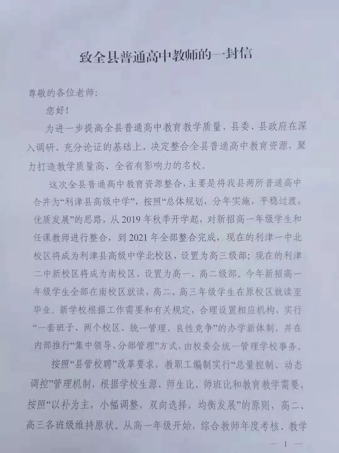 一中、二中合并,保留二中新校和一中北校区,更名为“利津县高级中学”。到2021年,二中新校(简称“南校区”)设置为高一、高二级部,一中北校区(简称“北校区”)设置为高三级部,实现“一套班子、两个校区、统一管理、良性竞争”的办学新体制。