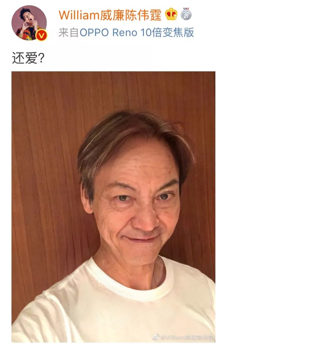 不少明星也忍不住尝试了一番,陈伟霆就在微博首当其冲发出了自己的老年妆,并问大家“还爱?”