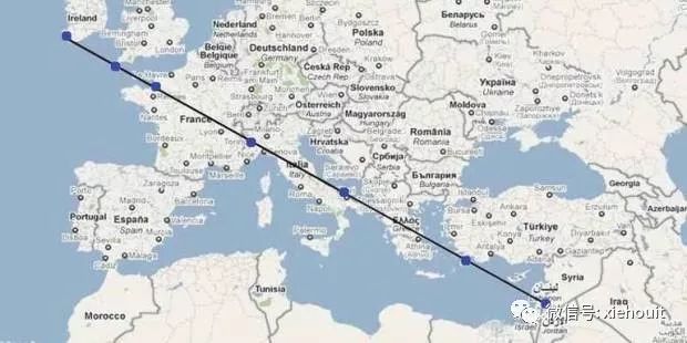 在教堂北墙边放了一幅地图,图上清晰地连接了从爱尔兰到耶路撒冷的一条直线,这条就是“圣弥额尔朝圣之路”。这条直线代表大天使砍杀魔鬼时的那把剑。