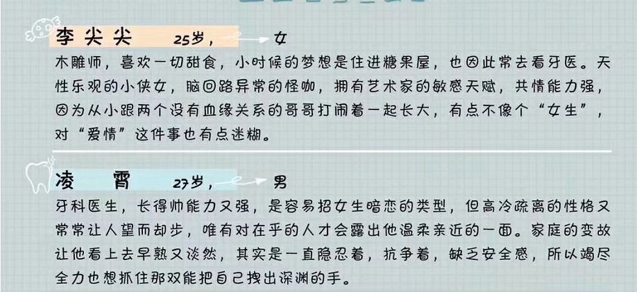 与之搭档的男主凌霄,由宋威龙出演,是个颜值极高且能力很强的牙科医生,容易招女生暗恋,但性格高冷疏离却总让人望而却步,唯有对在乎的人才会面对温柔的一面,家庭变故让他看上去早熟又淡然。宋威龙虽然没有多少代表作,但颜值高,演技也的确不错,还是很让人期待的。