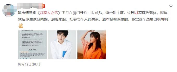 由于是暑期档,各类优秀剧作都相继开播,目前热播的《陈情令》、《亲爱的,热爱的》,都引领全民追剧热潮,也都取得了不错的口碑。当然,暑期既然有新剧开播,自然也有新剧开机,这不,近日又听闻一部新剧《以家人之名》即将开拍,网曝男女主是宋威龙和谭松韵,一时间掀起网络热议。