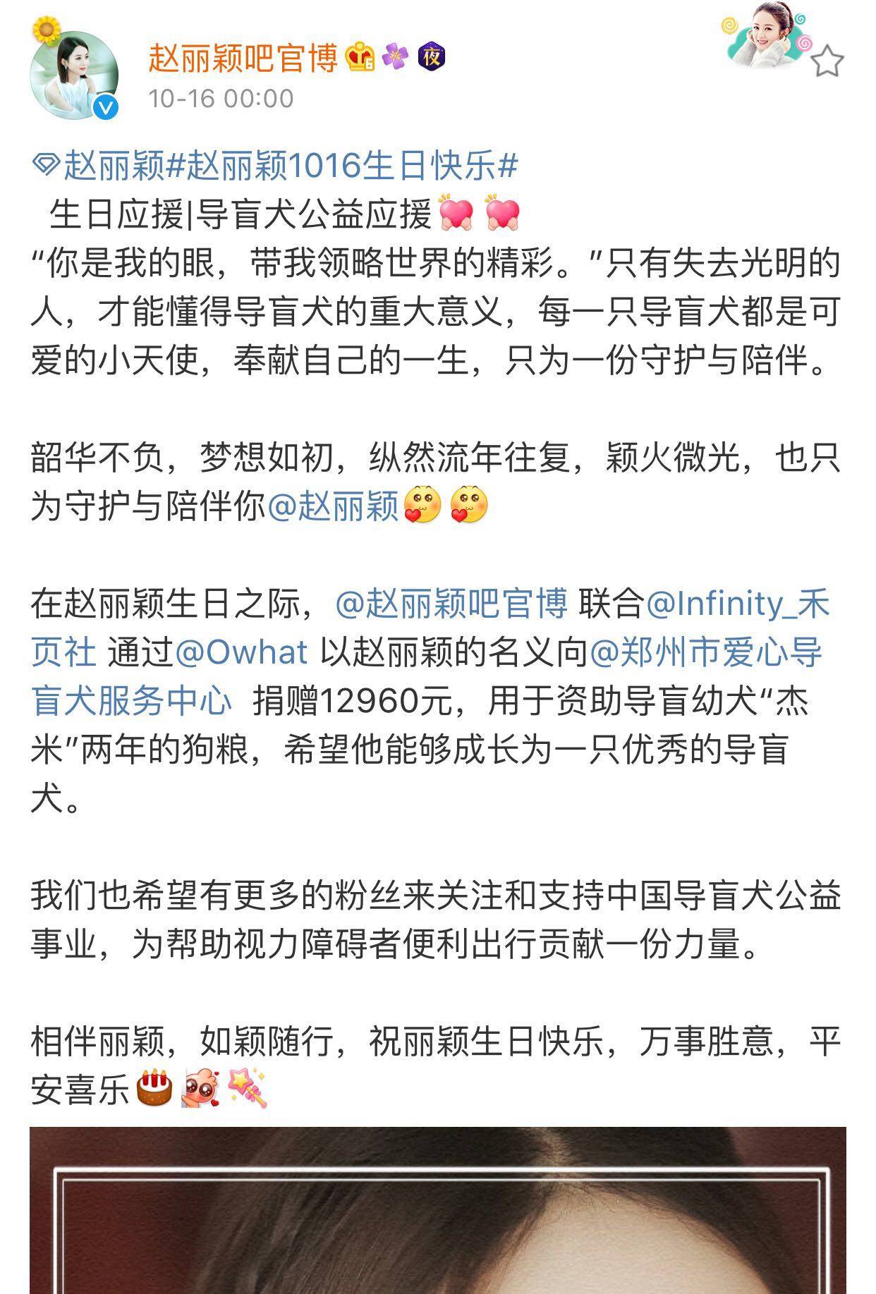 资助导盲幼犬两年的狗粮、为偏远山村希望小学搭建公益图书室、白血病专项救助等等公益应援。