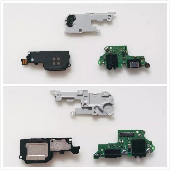 充电口有橡胶圈保护,扬声器通过金属触点和副小板相连。