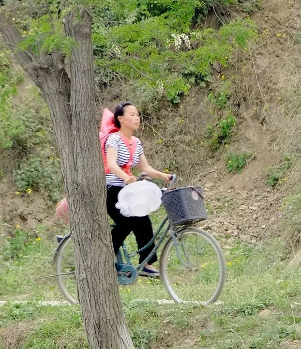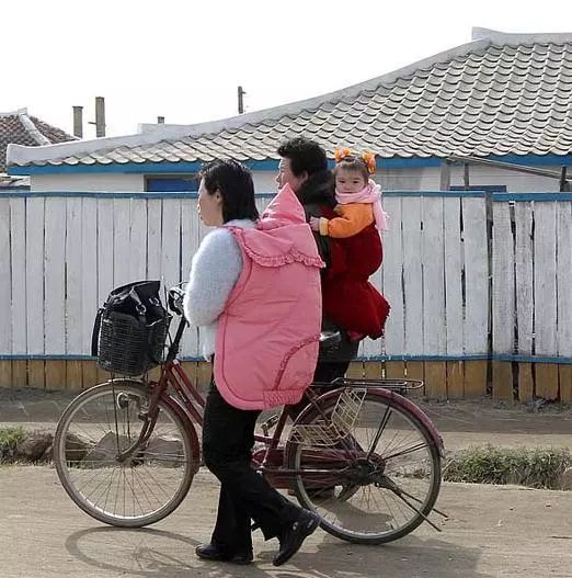 朝鲜农村,年轻妈妈们出门没有小汽车,只有自行车,小孩子就在后面背着。这种袋子很结实,有专门卖的。