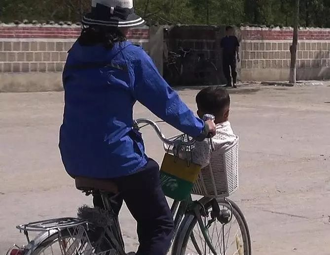 朝鲜人对车筐似乎情有独钟,除了装东西,还装孩子。平时身边遇到把孩子放车筐里的,我们一般都会友善的提醒一下,不安全。但在朝鲜,孩子坐车筐里非常普遍,妈妈很似乎一点也不担心。