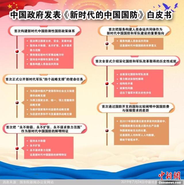 7月24日,中国政府发表《新时代的中国国防》白皮书。这是中国政府自1998年以来发表的第十部国防白皮书,也是中共十八大以来发表的首部综合型国防白皮书。