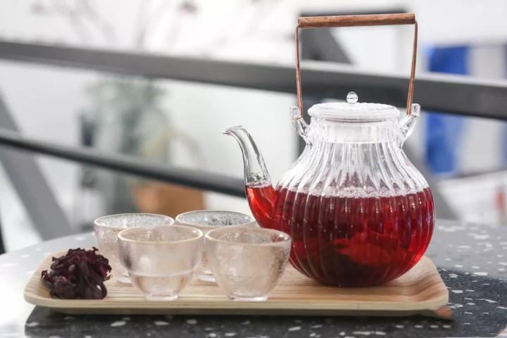 玫瑰洛神酸酸甜甜,隐约有种在喝酸梅汤的感觉。将茶壶拿到光线好的地方,还可以看到壶内有一整朵的云南墨红玫瑰,还有小的洛神花。