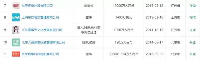 在章泽天所有的11家公司中,与投资相关的企业有4家,包括天镜资产、宿迁天强股权投资、东辰投资控股有限公司以及北京天强坤泰投资管理有限公司。