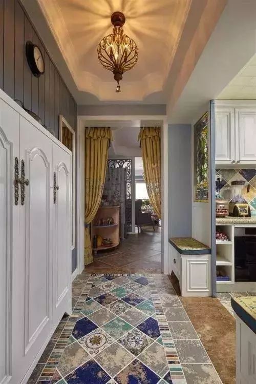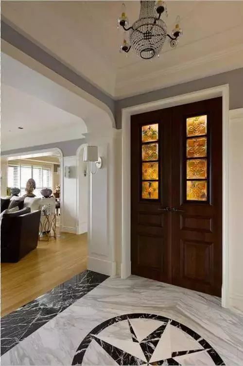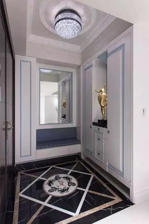 如果玄关呈正方形,那吊顶可以做笔记方正的样式,四周吊顶中间不吊顶,这样在天花板的中心安装上吊灯以后,和地面的地砖相对应,形成很妙的视觉效果。
