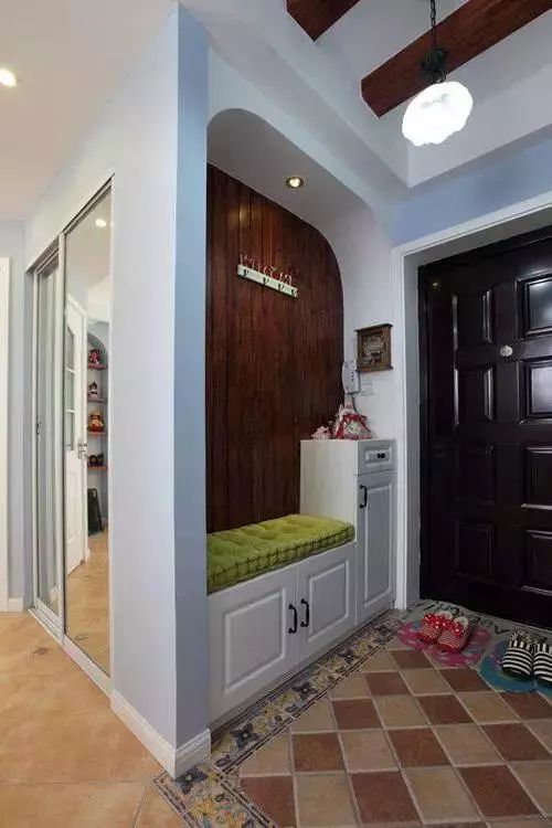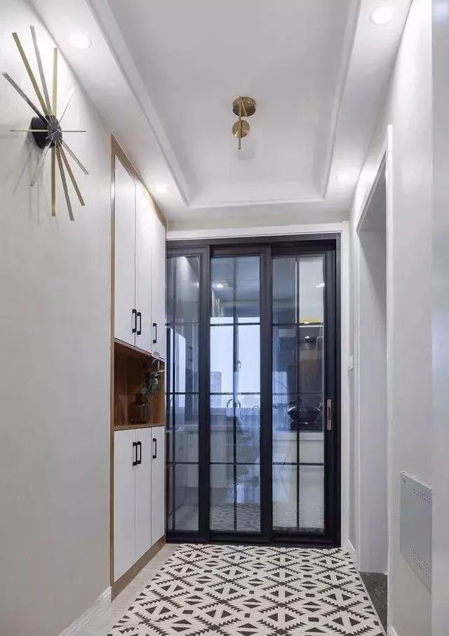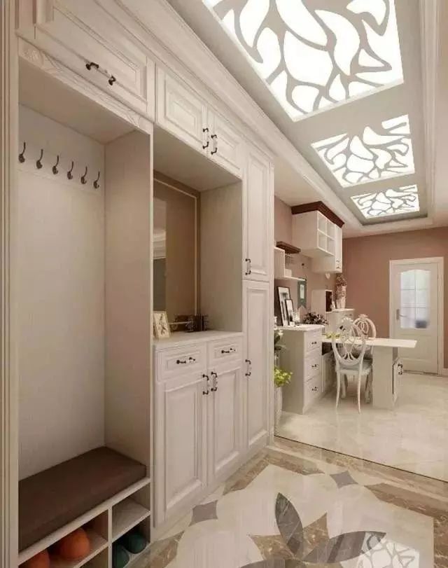 其实和正方形徐昂有异曲同工之妙,天花板的中央不吊顶,四周吊顶,因为玄关形状是矩形的,这样就在视觉上就会觉得玄关是一个完整的空间。