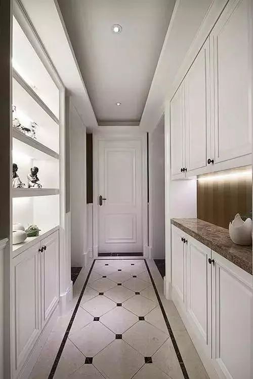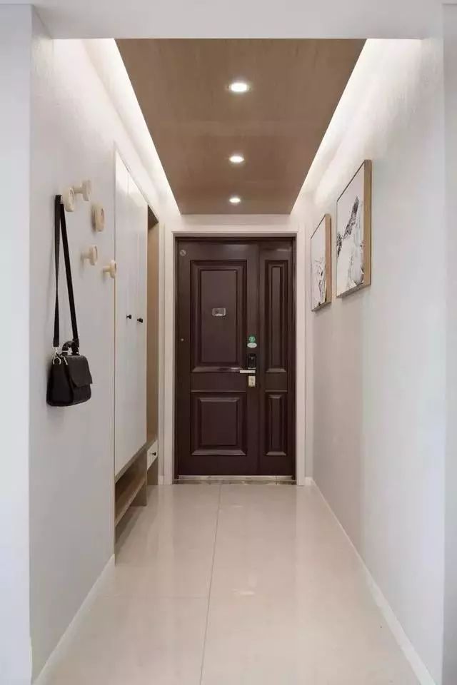 对于狭长型的玄关设计装修可不能太过随意了,因为狭长型玄本身就很像过道,吊顶太高就会显得冷清、恐怖,太低的话又会觉得压抑、沉闷,所以吊顶不能太华丽,但也不能呆板。
