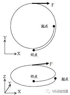 依据G02/G03之圆弧补间指令以及平面选择G指令(G17,G18,G19),在选择平面内,可以一边做圆弧补间,一边做第3轴的直线补间。一般而言,螺旋补间的速度被指定为包含第3轴补间成分的切线速度F,如图中的上图所示 无论如何,当圆弧平面成分的速度指定时,其被指定在圆弧平面切线速度F,就如图中的上图所示。NC会自动计算螺旋补间的切线速度F,所以在圆弧平面上的切线速度就是F。