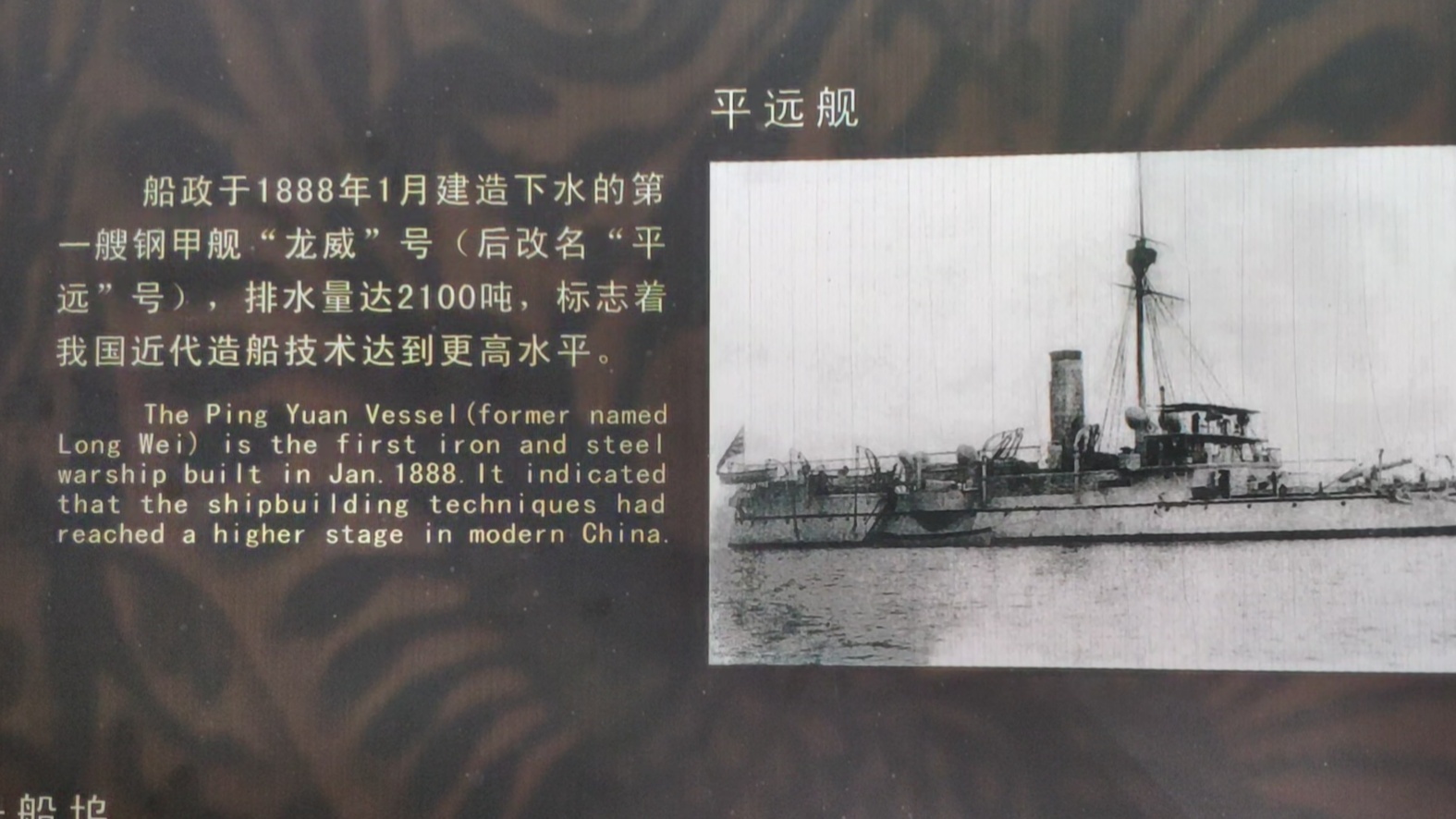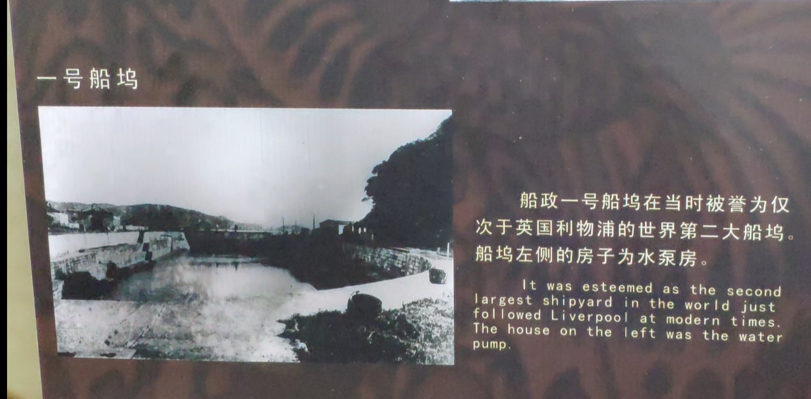 福州马尾的一号船坞是在清朝的时候所建设。 据说在当时一号船坞的规模是世界上第二大船坞,仅次于英国。可以看得出来,在当时的福州船政造船技术还是属于世界一流水平。后来在日军进入福州城的时候,船坞遭到破坏。2004年9月15日,福州市将复制的中国第一艘钢甲战舰“平远”号,放置在马尾船政一号船坞,供游人登舰观赏。这是福建省历史上首次复制福建船政所建造的兵舰。这只军舰,高傲地占在马尾,向人们展示着中国现代海军创始的艰难之路,展示着现代海军创始者们让中国走向海洋的志向,它既向人们说明了中国的强国之梦是怎么在一些丑陋的积习中失败的,也以失败和屈辱衬托出中国精英们高尚的灵魂和永驻历史的风采。