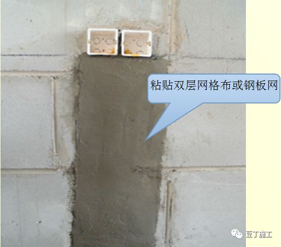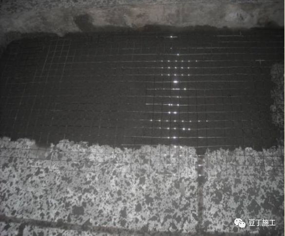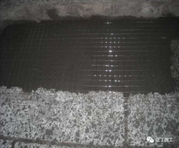 6.7 管线槽浇水湿润后,用砂浆嵌填抹压密实,然后素水泥胶浆粘贴两层玻纤网格布或钢板网。