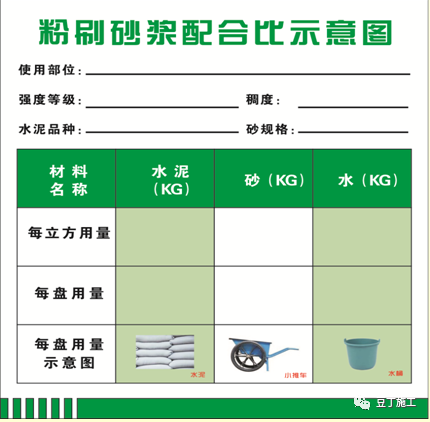 2)现场设置配合比标志牌;根据现场砂子原材含水率换算成施工配合比,施工时应通过磅秤称量。