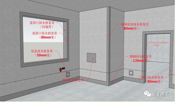 7.20 内墙抹灰完成后,如设计无内墙批白,应在如下部位做内墙抹灰修饰带或修饰块: 1、内阳角部位,修饰带宽80mm; 2、门窗洞口阳角部位,修饰带宽80mm,门窗安装面修饰带宽同墙厚; 3、电盒、电箱、线盒周围,修饰带宽50mm。 4、踢脚线处,修饰带高120mm。 5、墙面空鼓开裂处,修补后做抹灰修饰块,大小应覆盖修复区域。