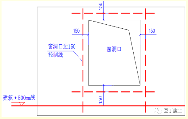 5.3 墙面抹灰完成后,应在墙体上弹建筑﹢500mm线,窗洞口应根据外墙立面排版及建筑﹢500mm线弹窗洞口收边控制线,控制线距抹灰完成后窗边150mm。一般窗洞口长宽比窗框尺寸大10mm。