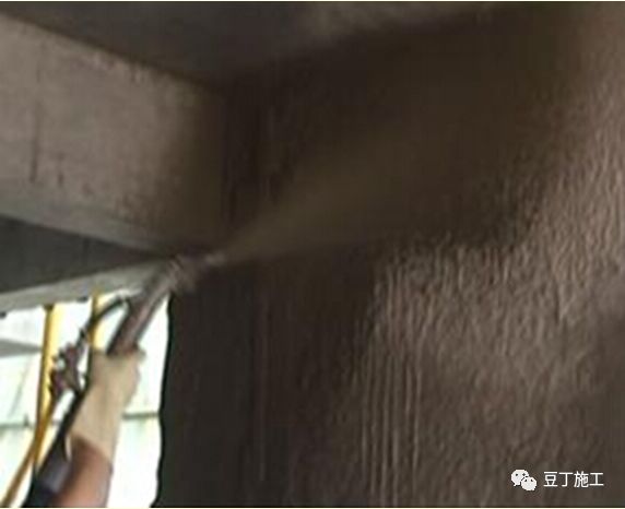 4)墙体扫浆;喷涂时,将浆料以圆点、网状形式均匀覆盖基层,形成的喷浆点高度应为1~3mm,圆点底部直径 2~5mm。喷涂应均匀,对喷射不均匀的部位应进行二次喷射处理。