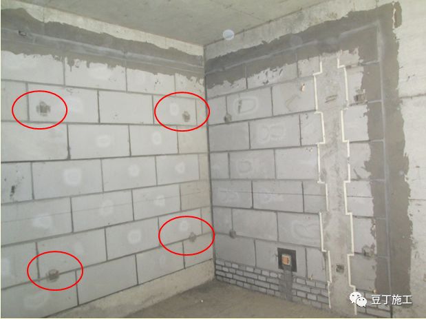 1)墙体清理干净;将房间内墙面上钢筋头、拉丝杆、铁钉全部切割(要求切割后不高于墙面)完毕,墙面上模板条、模板皮、方木条、双面胶条全部清净。
