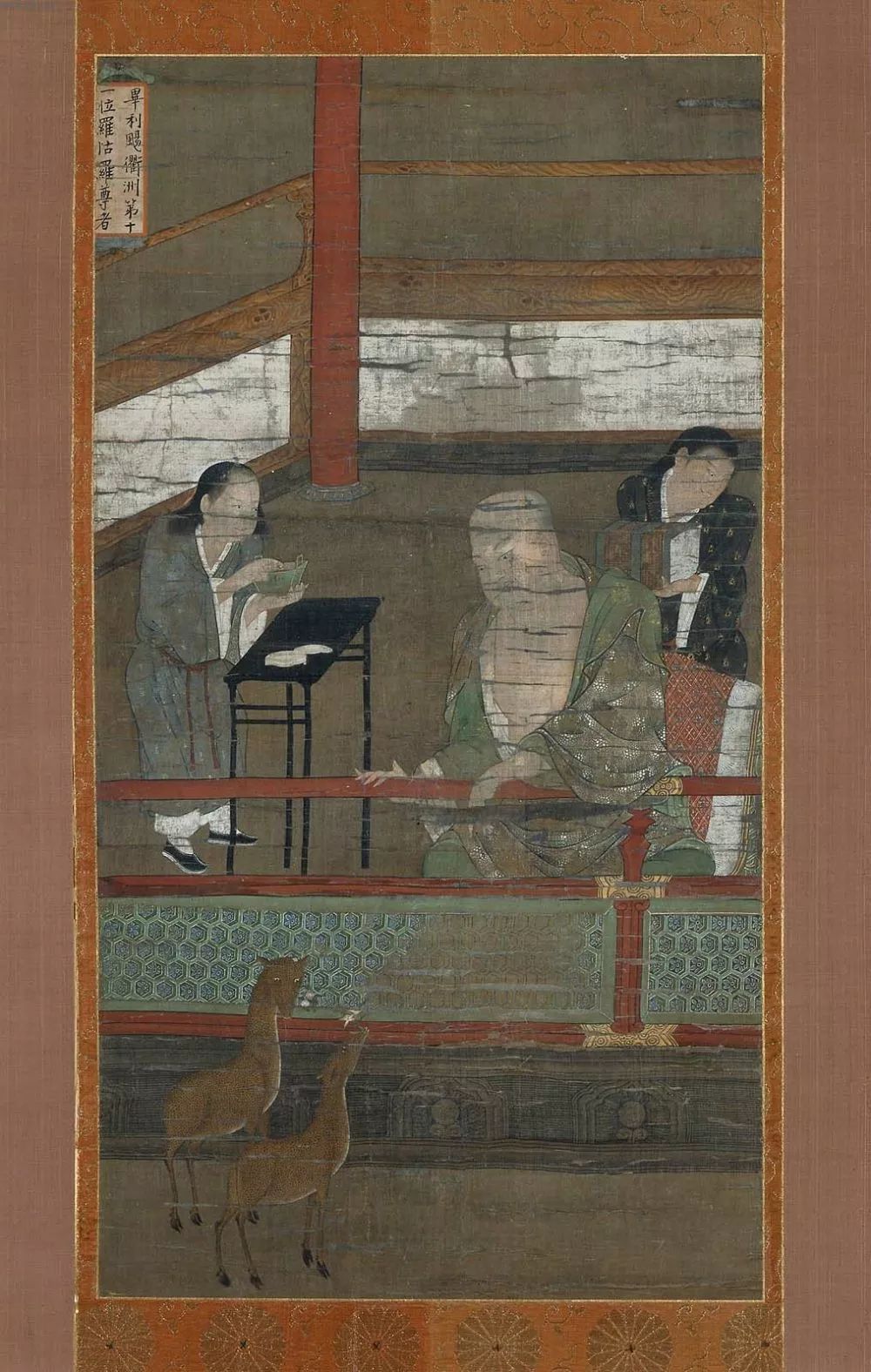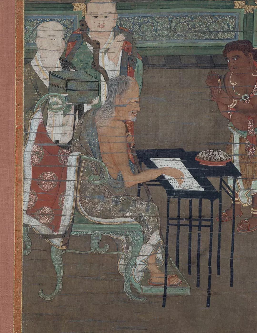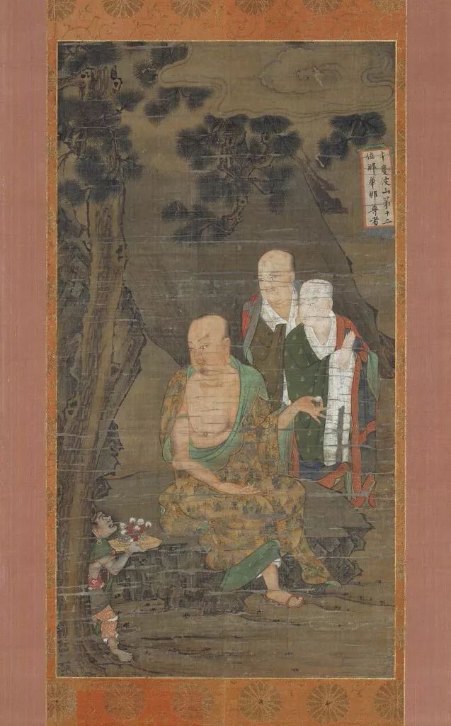 此套《十六罗汉图》为绢本设色,每幅纵80厘米,横41.5厘米。其中有十五幅收藏在美国波士顿美术馆,另有一幅收在日本相国寺。